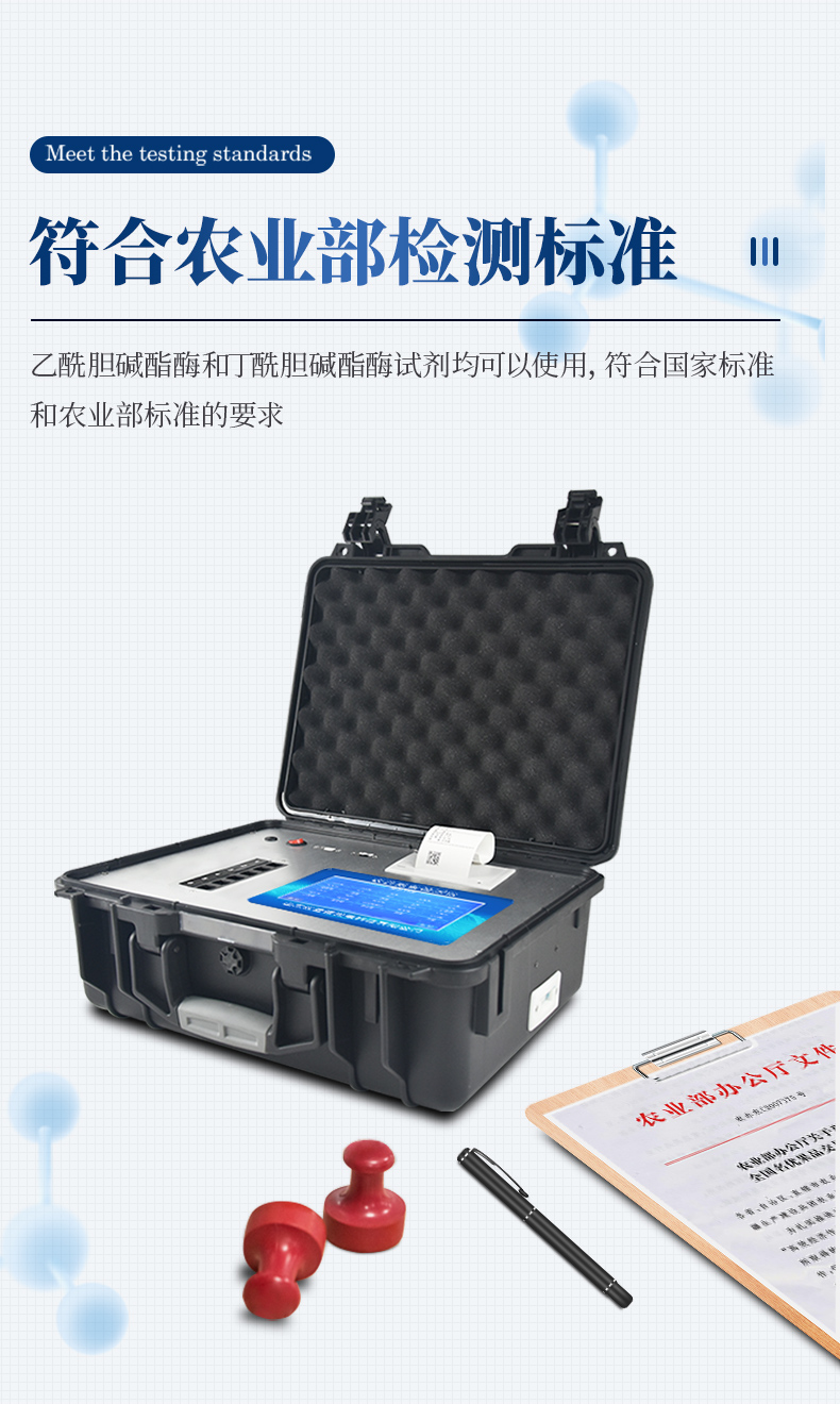 檢測標準:依據國家標準方法(GB/T5009.199-2003)以及世界衛生組織WHO、世界糧農組織FAO殘留農藥檢測標準、世界環境保護局EPA參照攝入量等要求來設計。采用酶抑制率比色法對水果、蔬菜等農產品中有機磷和氨基甲酸酯類農藥含量進行快速準確的檢測。