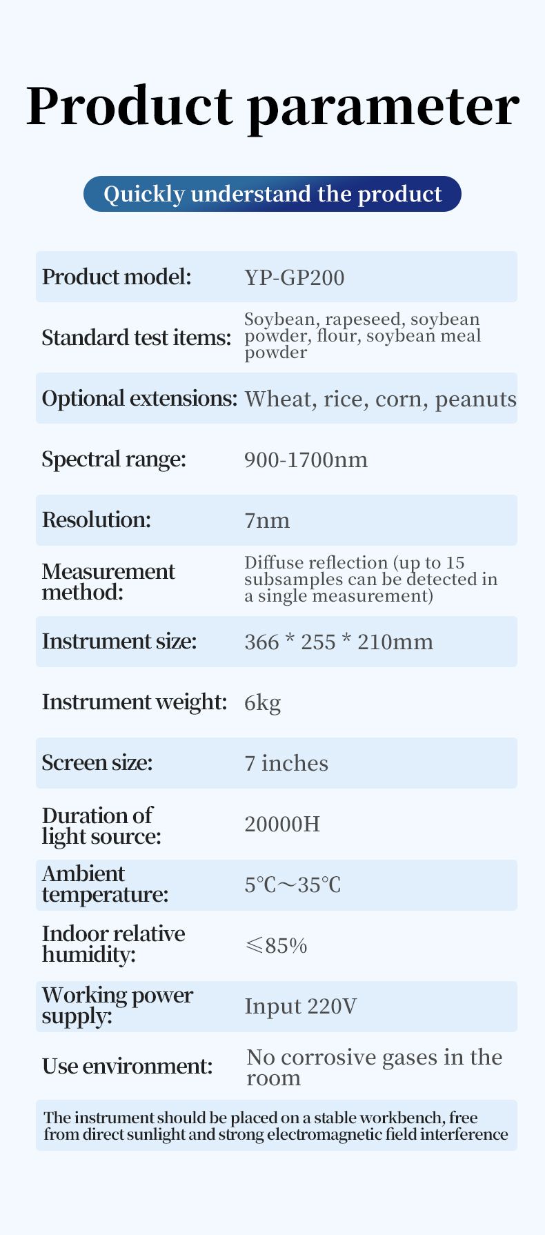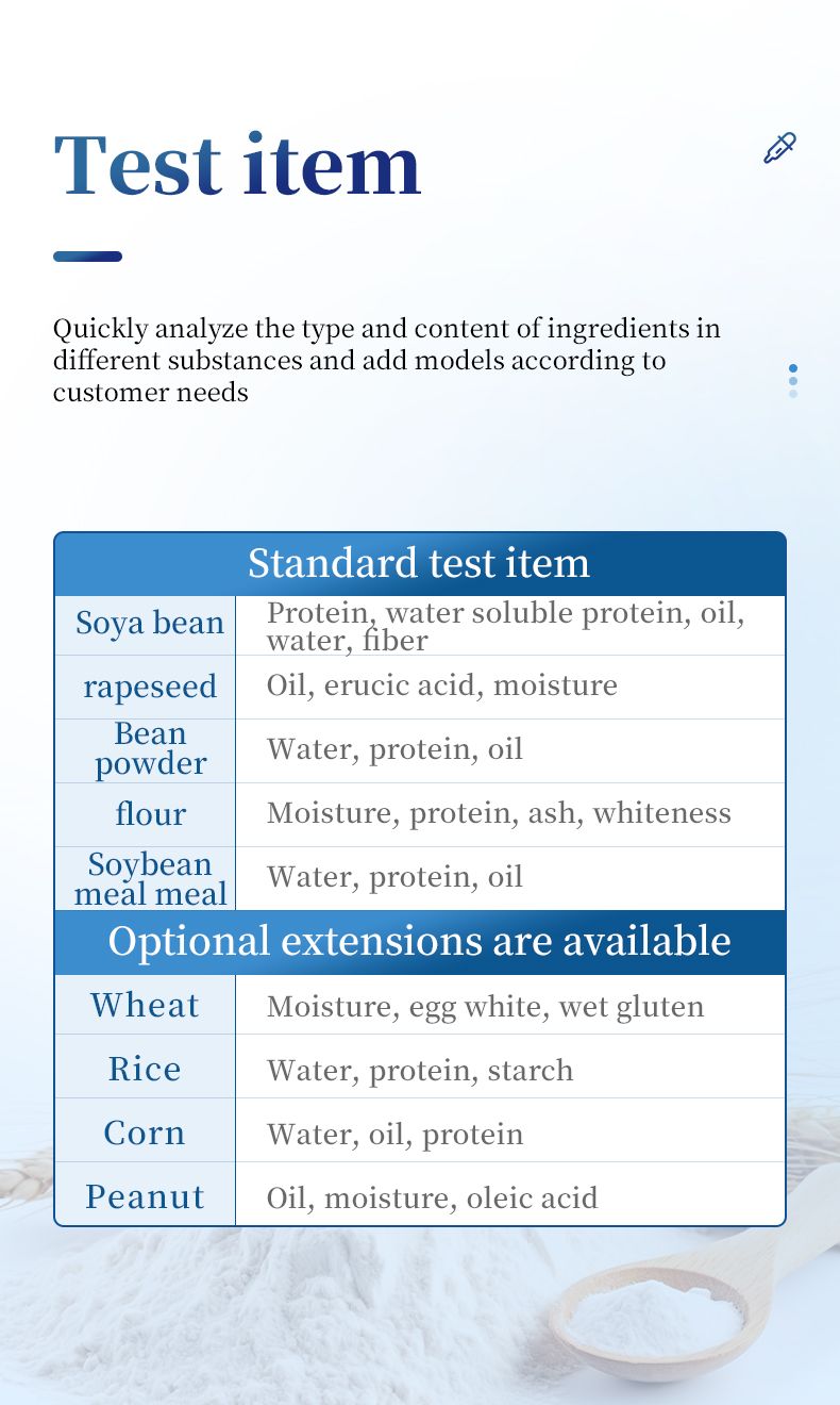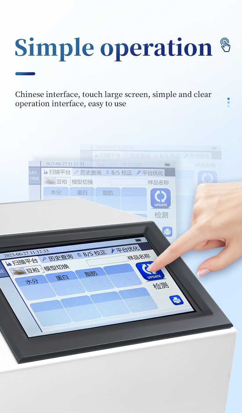This instrument is a near-infrared (NIR) spectroscopy analyzer. It can quickly analyze the types and contents of components in different substances (such as protein, moisture, fat, fiber, ash, etc.) based on the spectra generated when the sample is irradiated by near-infrared light. Models can be added according to customer requirements.