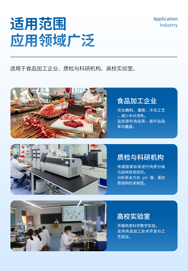 肌肉系水力的高低,取決于宰后肌肉的 PH。國內通常采用加壓重量法來度量肌 肉失水率,以估計肌肉的系水力,即失水率越高,系水力越低。系水力(%)=(壓前肉樣重-壓后肉樣重)一壓前肉樣重 x100%。系水力:指肌肉蛋白質在外力作用 下保持水分的能力采用貯存損失 熟肉率及失水率測定肌肉的系水力。應用于食品包裝廠家、質檢、商檢、大學、 科研等部門。