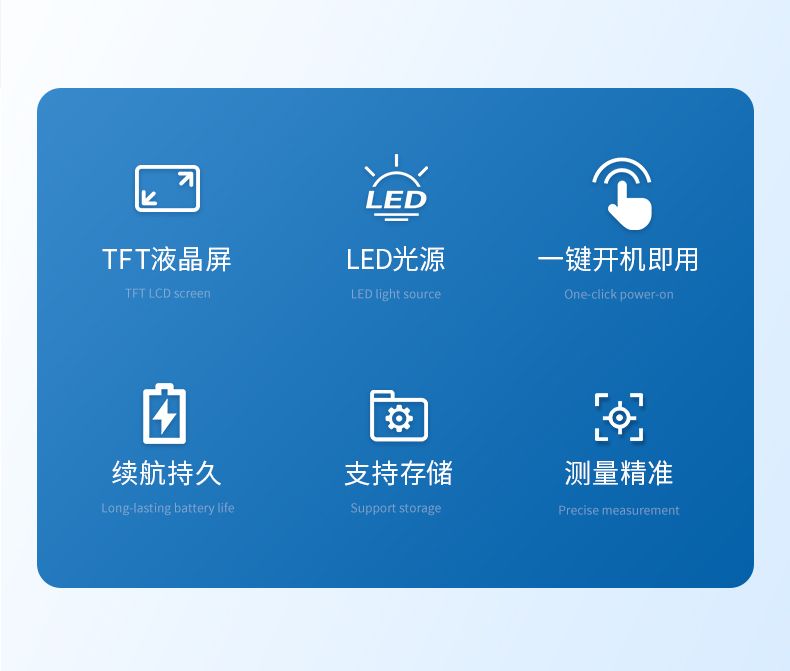 儀器支持存儲、查閱共200套測量數據; 具有電池電量提示功能,設有5分鐘無按 鍵操作下的自動關機功能,續航持久;