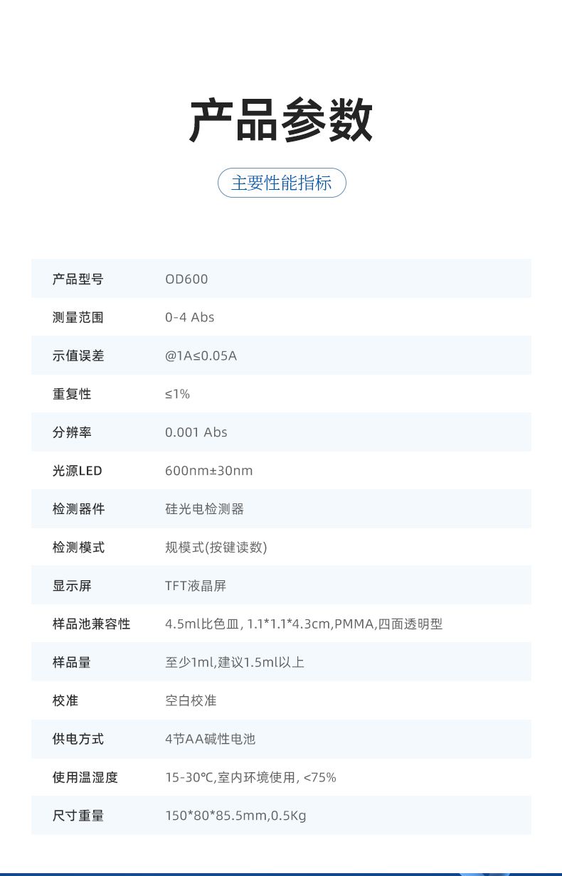 OD600是一款測量0-4Abs范圍內細菌等培養液在600nm波長下的吸光度 (Optical Density,OD), 從而間接評估細胞密度和生長狀態的儀器。基于朗伯-比爾定律 (Lambert-Beer Law): 當波長為600nm的光穿過樣品時,細胞會散射和吸收光線,吸光度 (OD 值)與細胞密度成正比。可廣泛應用于微生物學、分子生物學、發酵工程和生物制藥等領域。