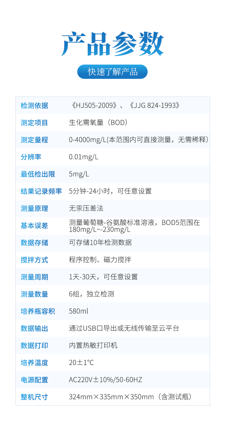 生化需氧量(BOD)測定儀是根據國家標準《HJ505-2009》5日培養法,模擬自然界中有機物的生物降解過程,采用簡單、安全、可靠的無汞壓差感測法測量水中BOD濃度;全智能化設計,領先的研發工藝和設計制造,實驗過程無需實驗人員值守;適用于排污企業、環境監測、污水處理廠、第三方檢測機構、科研、高校等領域的生化需氧量測定。