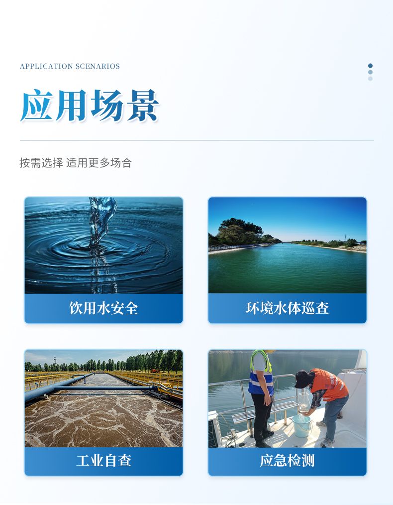 儀器將復雜的實驗室分析流程集成于手持機身中,操作簡捷,可在現場數分鐘內獲得可靠結果。其性能符合國家標準方法要求,適用于飲用水安全篩查、環境水體巡查、工業廢水排放監控及應急檢測等多種場景,是保障用水安全、實現高效現場管控的得力工具。