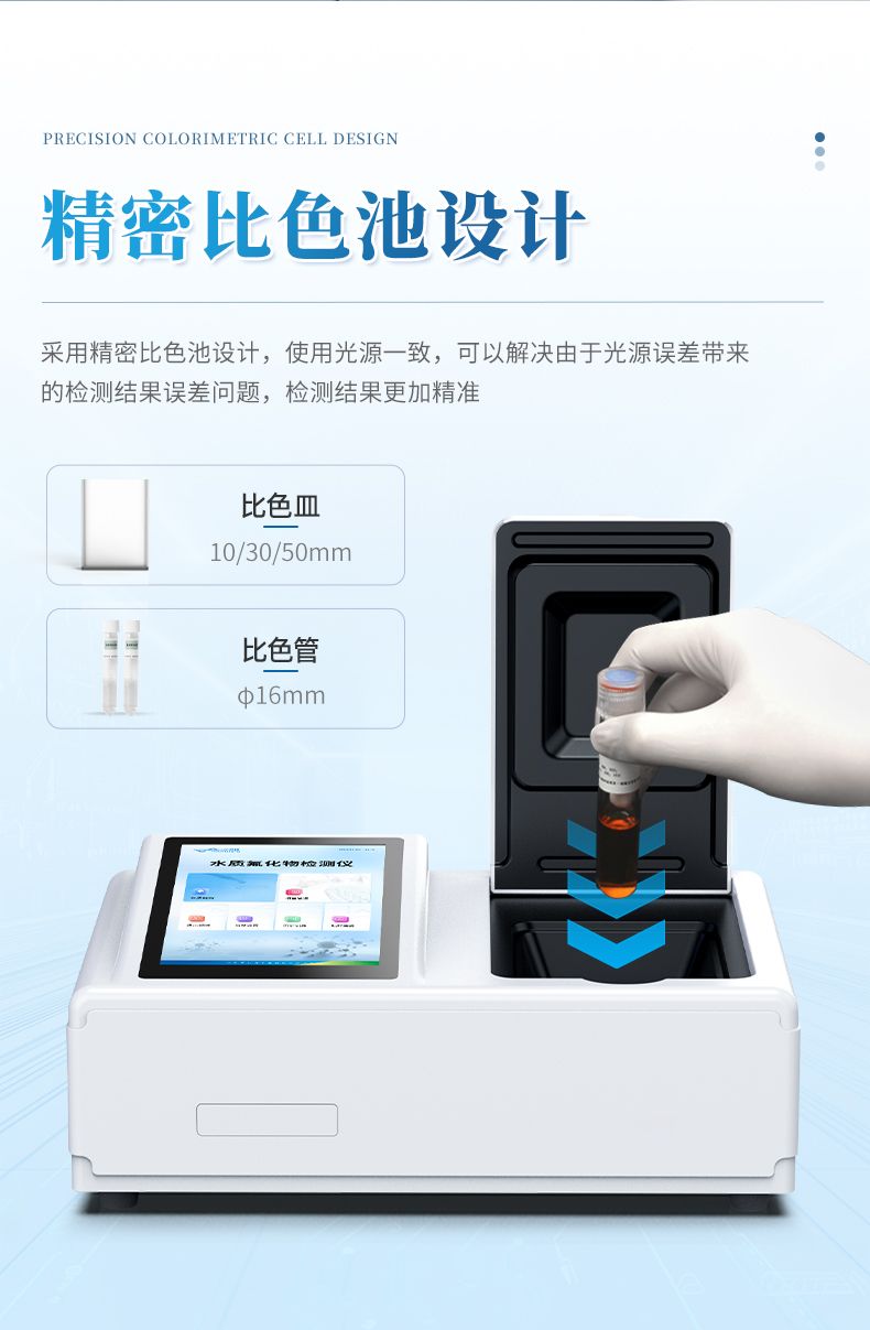 本儀器采用氟試劑分光光度法(國標方法原理)。水樣中的氟離子在特定酸度下,與氟試劑及硝酸鑭反應,生成穩定的藍色三元絡合物,其顏色深度與氟離子濃度成正比。儀器內的精密光學系統會測量該溶液的特定波長吸光度,并自動依據預先內置的校準曲線,直接計算出水中氟化物的準確濃度值(mg/L)。該方法抗干擾能力強,結果準確可靠。