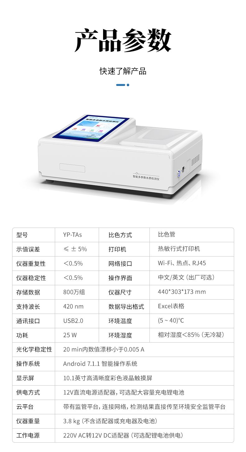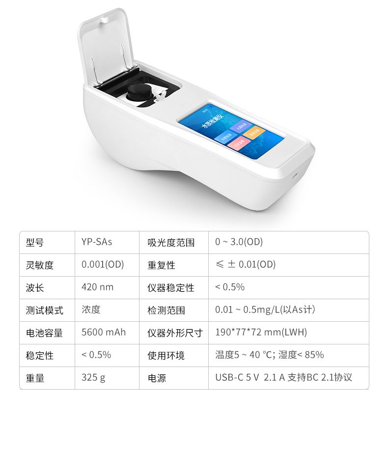 水中砷檢測儀是一款基于分光光度法原理研發(fā)的智能化水中總砷檢測儀,專門用于飲用水、地表水、地下水及廢水中總砷的快速定量分析。儀器采用高性能LED光源與大面積光電池,結(jié)合優(yōu)化的硝酸銀-聚乙烯醇吸收顯色體系,確保了在420nm波長下檢測的高靈敏度與穩(wěn)定性。其搭載的Android智能操作系統(tǒng)與,使操作直觀流暢;具備萬條數(shù)據(jù)存儲、Wi-Fi/藍牙傳輸及防水機身,非常適合實驗室與現(xiàn)場檢測場景。儀器支持多點標(biāo)定與內(nèi)置曲線,配合Type-C通用充電與長續(xù)航設(shè)計,為用戶提供了準(zhǔn)確、便捷、可靠的一體化砷檢測解決方案。