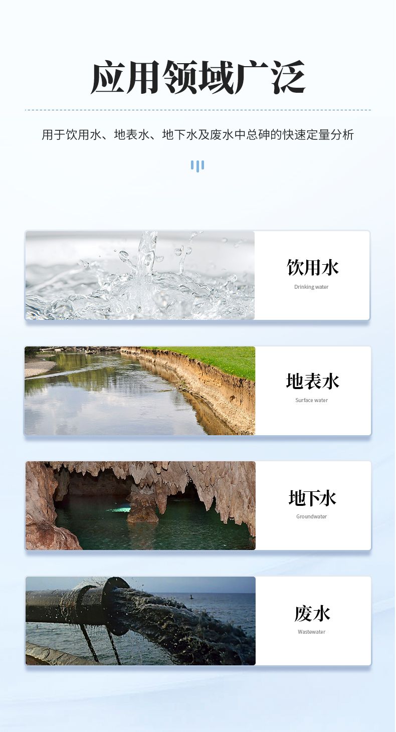 本儀器基于分光光度法原理,專門用于各類水體中總砷的定量檢測,其測量范圍覆蓋0.01mg/L至0.50 mg/L。該儀器適用于環(huán)境監(jiān)測領(lǐng)域?qū)Φ乇硭⒌叵滤幕A(chǔ)調(diào)查與常規(guī)監(jiān)測;是水務(wù)部門對飲用水源、出廠水及管網(wǎng)末梢水進行砷含量安全篩查的可靠工具;同時可應(yīng)用于工業(yè)廢水、生活污水等排放口水樣的合規(guī)性檢測(復(fù)雜樣品需經(jīng)標(biāo)準(zhǔn)消解預(yù)處理)。此外,在農(nóng)業(yè)灌溉水水質(zhì)評估、第三方檢測實驗室的批量分析、科研機構(gòu)的項目研究以及應(yīng)急污染事件的現(xiàn)場快速排查等場景中,本儀器均能提供準(zhǔn)確、便捷的檢測支持。其方法符合國家標(biāo)準(zhǔn)核心原理,操作簡便,結(jié)果穩(wěn)定,是環(huán)保、衛(wèi)生、水務(wù)、工礦企業(yè)及科研教育機構(gòu)進行水質(zhì)砷分析的理想選擇。