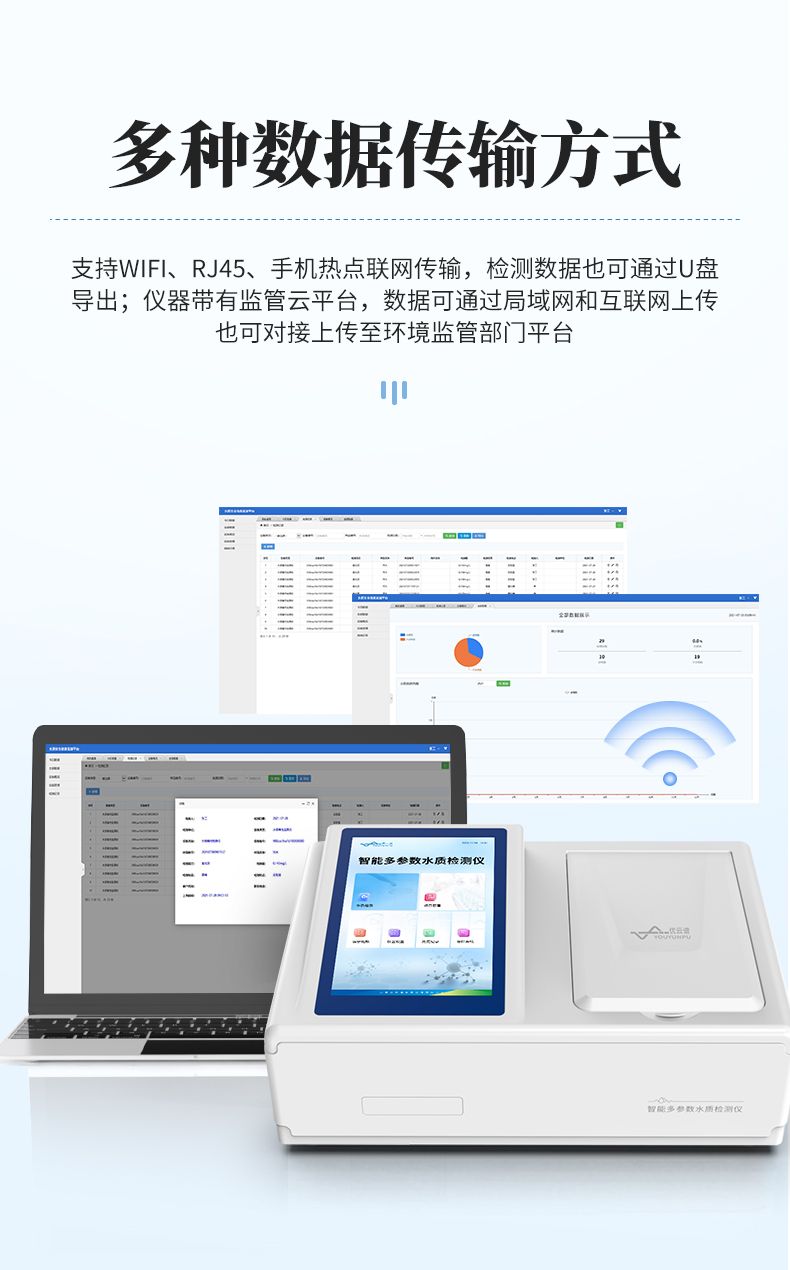 8.儀器帶有監(jiān)管云平臺,數(shù)據(jù)可通過局域網(wǎng)和互聯(lián)網(wǎng)上傳,亦可對接上傳至環(huán)境監(jiān)管部門平臺。