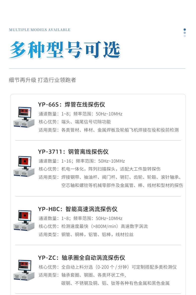 具有相對獨立的檢測通道,可同時驅動兩款不同形式的檢測探頭(由絕對和差動線圈構成的組合式探頭等),兩個檢測通道同時進行數據采集,用于檢出金屬管、棒生產中出現的縱向和橫向裂紋缺陷。用于焊管在線、離線檢測時,儀器對金屬管、棒、線材的裂紋、暗縫、氣孔、夾雜和開口裂紋等缺陷具有很高的檢測靈敏度。對生產過程中,因焊機故障而造成產品的緩變傷、長道傷均能可靠檢出。