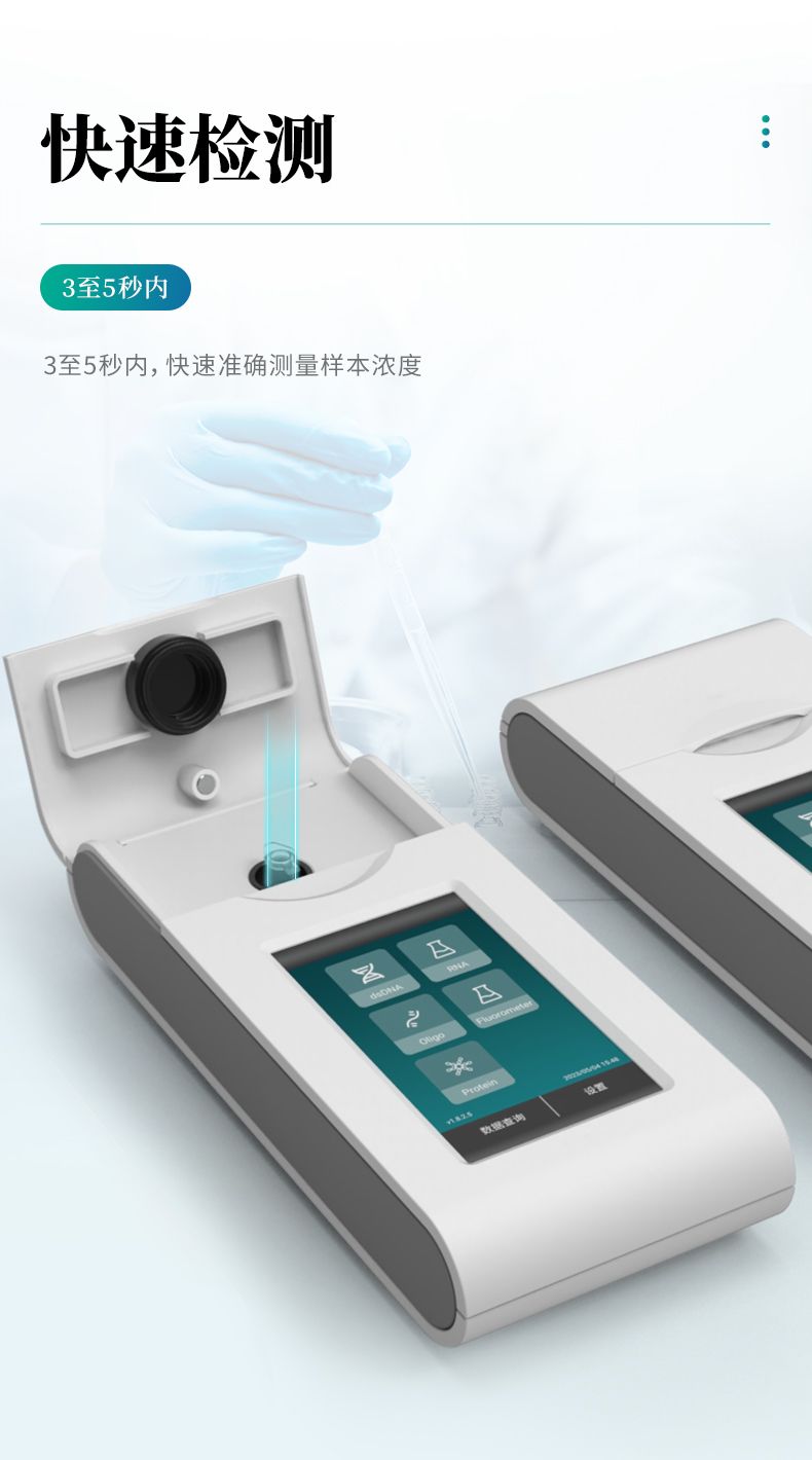 度。儀器僅需 1-20 μL 樣品即可實現精確的濃度測定,操作快速且結果準確,極大減少了樣品消耗和 實驗時間。該設備特別適用于科研實驗室中低濃度核酸和蛋白質的檢測需求,廣泛應用于NGS文庫構 建中的DNA定量、RNA定量、PCR實驗中的核酸濃度測定等場景,提供可靠的實驗數據支持。
